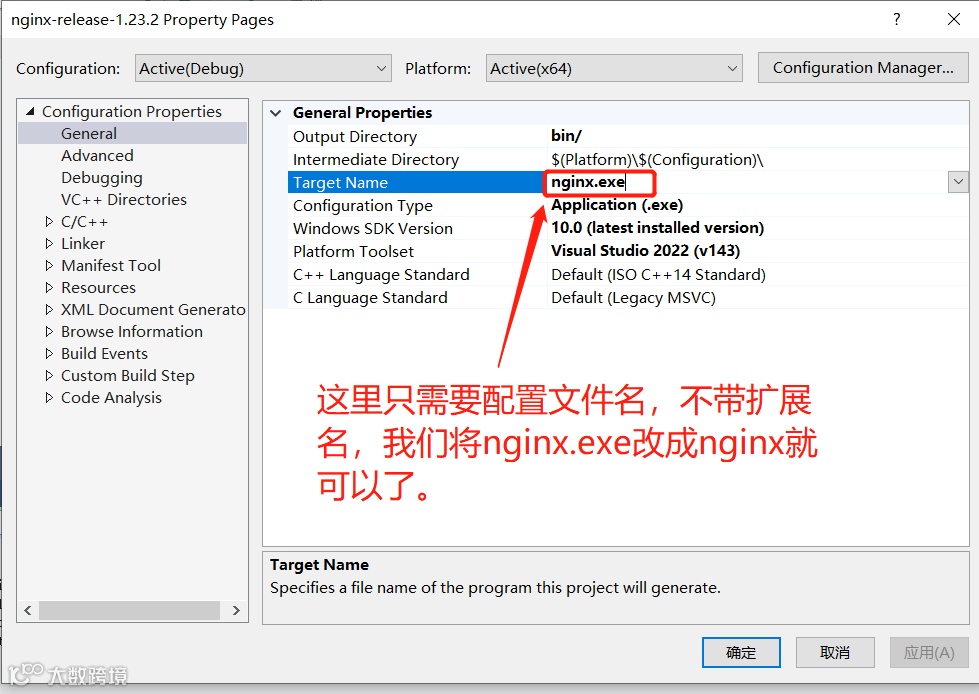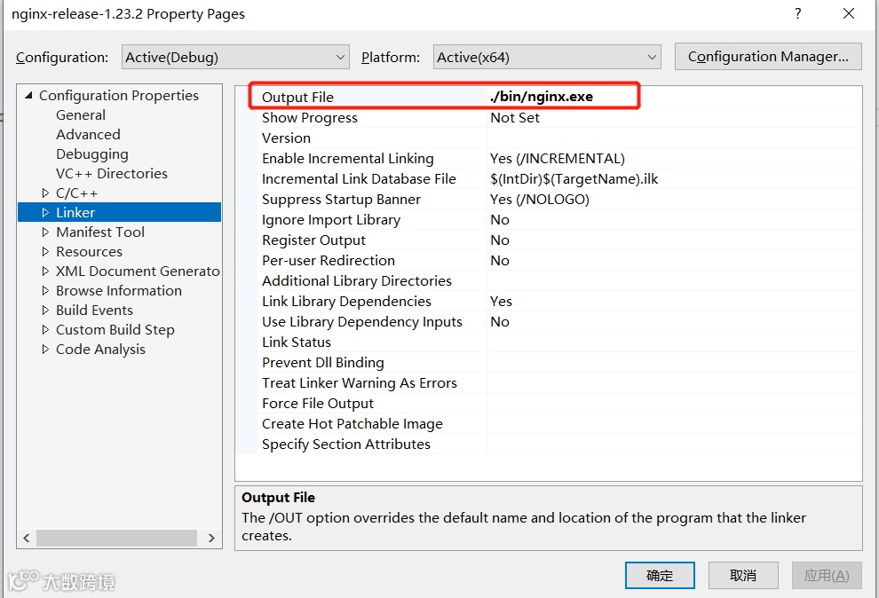 将目标输出文件修改为 ./bin/nginx.exe,一共有两个地方需要修改。