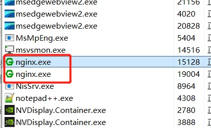 这个时候,任务管理器中仍然有两个 nginx.exe,其中有一个是上次调试时产生的,不会自动退出,我们如果区分不了,将两个都结束掉,然后重新启动调试即可。