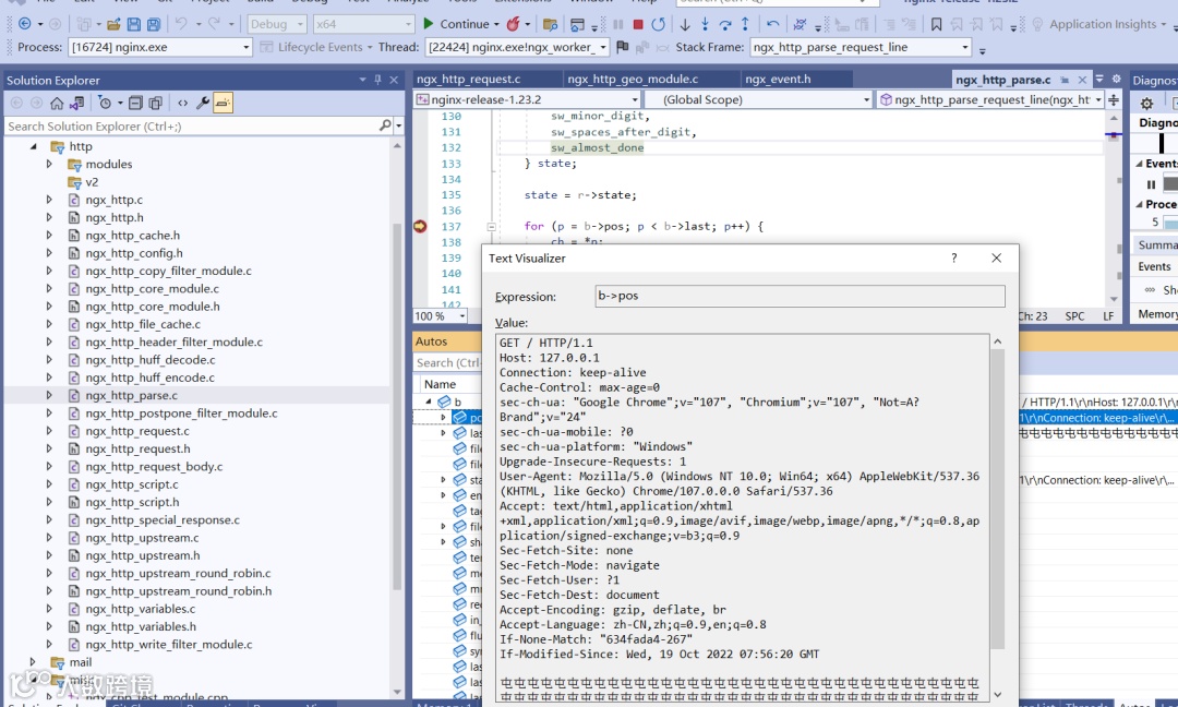 现在,我们在 ngx_http_parse.c:137 行添加一个断点,然后再次在浏览器中访问 http://127.0.0.1,断点按预期的效果触发,我们可以看到接收缓冲区就是浏览器发给我们的 HTTP 报文。