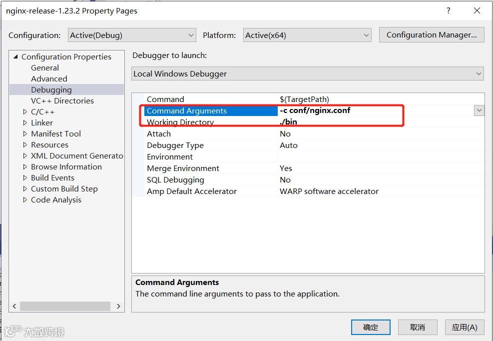 然后在 VS 工程属性设置中将工作目录改成 bin 目录,同时设置命令行参数为 -c nginx.conf。