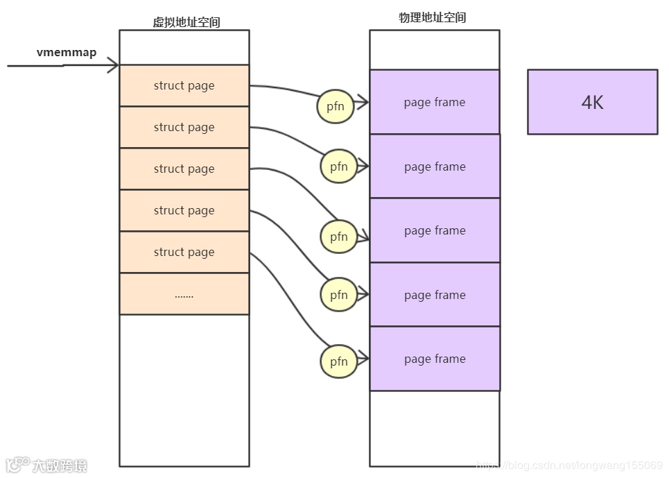 为了描述一个物理page,内核使用struct page结构来表示一个物理页。假设一个page的大小是4K的,内核会将整个物理内存分割成一个一个4K大小的物理页,而4K大小物理页的区域我们称为page frame