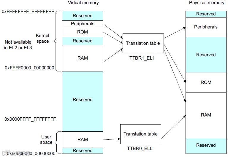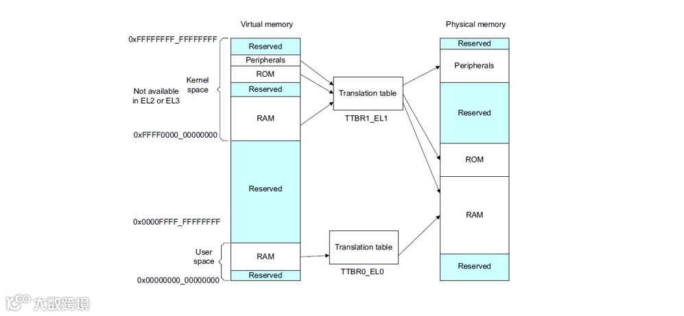 MMU根据虚拟地址的最高位判断用哪个页表基地址做为访问的起点。最高位是0时,使用TTBR0_EL0作为起点,表示访问用户空间地址;最高位时1时,使用TTBR1_EL1作为起点,表示访问内核空间地址。MMU从相应的页表基地址寄存器TTBR0_EL0或者TTBR1_EL1,获取PGD页全局目录基地址。