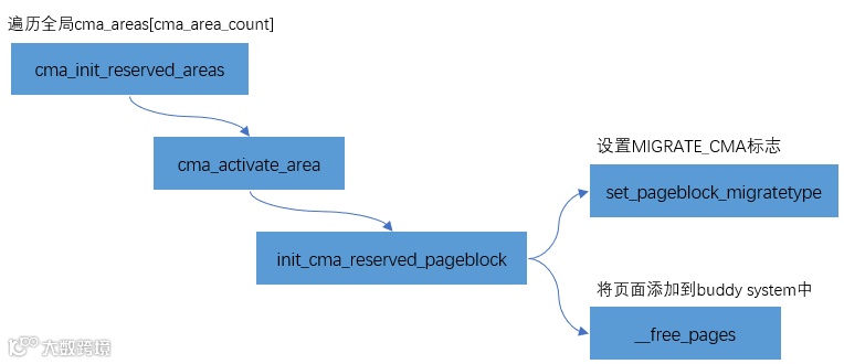 为了避免这块reserved的内存在不用时候的浪费,内存管理模块会将CMA区域添加到Buddy System中,用于可移动页面的分配和管理。CMA区域是通过cma_init_reserved_areas接口来添加到Buddy System中的。