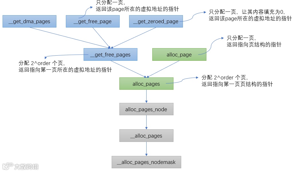 内核中根据不同的分配需求有6个函数接口来请求页框,最终都会调用到__alloc_pages_nodemask。