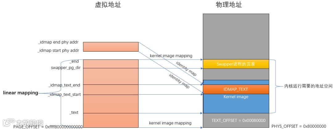identity map:是指把idmap_text区域的物理地址映射到相等的虚拟地址上,这种映射完成后,其虚拟地址等于物理地址。idmap_text区域都是一些打开MMU相关的代码。 -