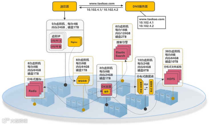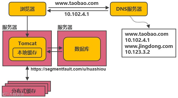 以淘宝作为例子。在网站最初时,应用数量与用户数都较少,可以把Tomcat和数据库部署在同一台服务器上。浏览器往www.taobao.com发起请求时,首先经过DNS服务器(域名系统)把域名转换为实际IP地址10.102.4.1,浏览器转而访问该IP对应的Tomcat。