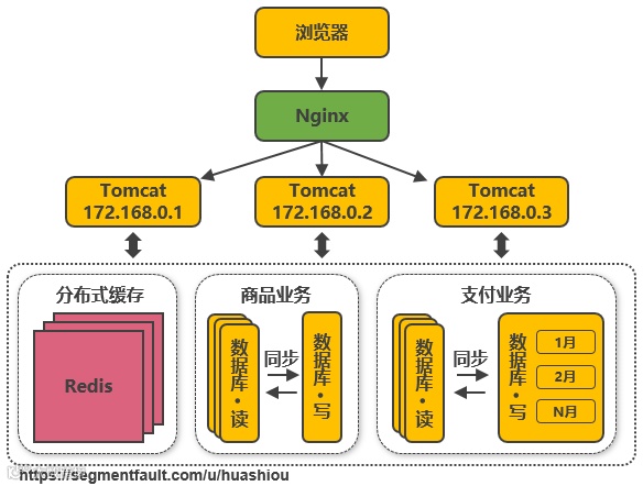 此处需要注意的是,上图中从Nginx层到Tomcat层这样画并不代表全部Nginx都转发请求到全部的Tomcat,在实际使用时,可能会是几个Nginx下面接一部分的Tomcat,这些Nginx之间通过keepalived实现高可用,其他的Nginx接另外的Tomcat,这样可接入的Tomcat数量就能成倍的增加。