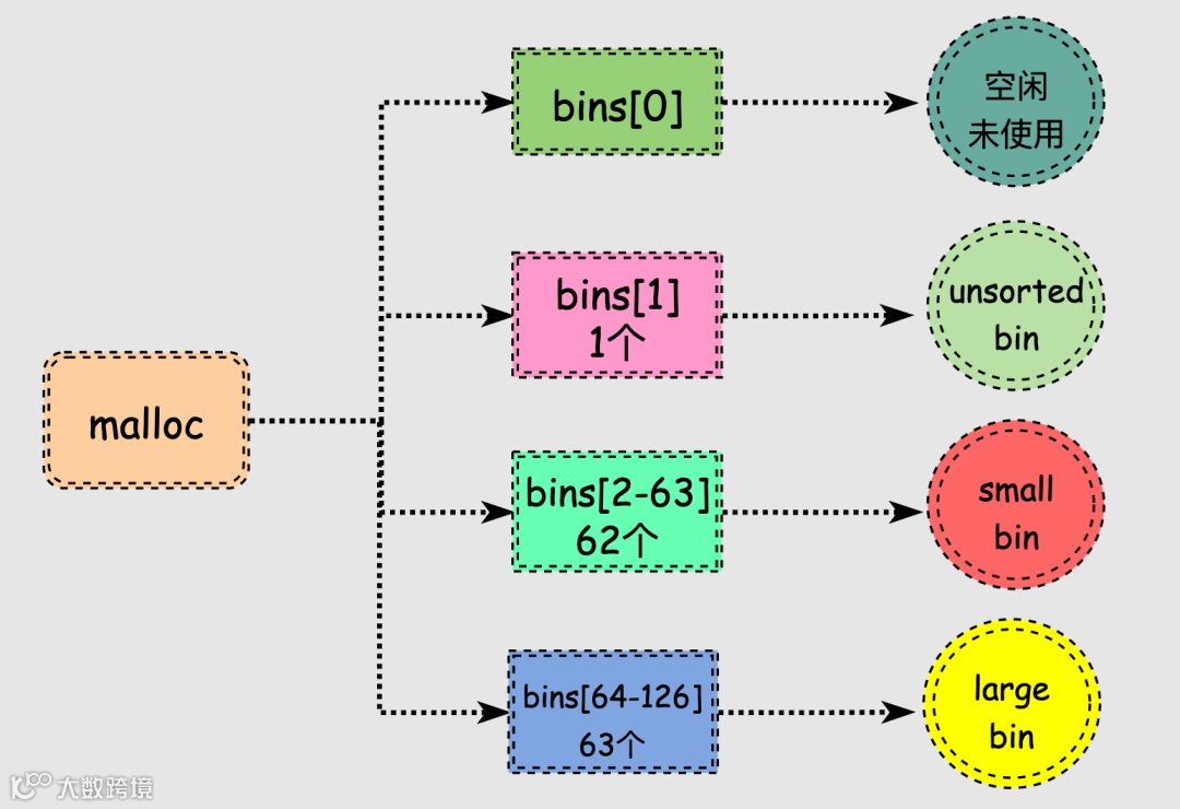 malloc一共维护了128个bin,并使用一个数组来存储这些bin。