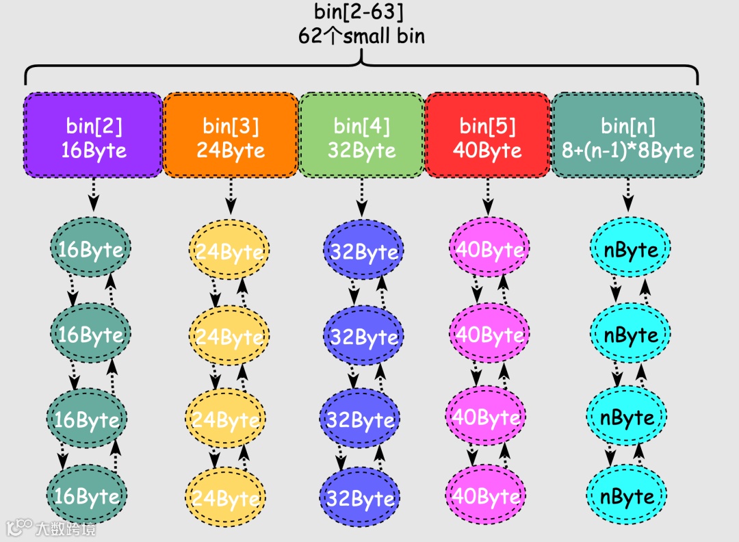 bins[2,63]总计长度为62的区间称为small_bins,用于维护<512B的内存块,其中每个bin中对应的链表中的chunk大小相同,相邻bin的大小相差8字节,范围为16字节到504字节。