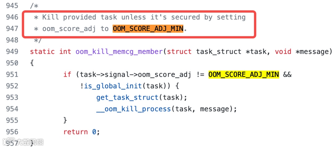 进程设置OOM_SCORE_ADJ_MIN时,说明该进程为不可被杀死,返回的得分就非常低,从而被oom killer豁免。