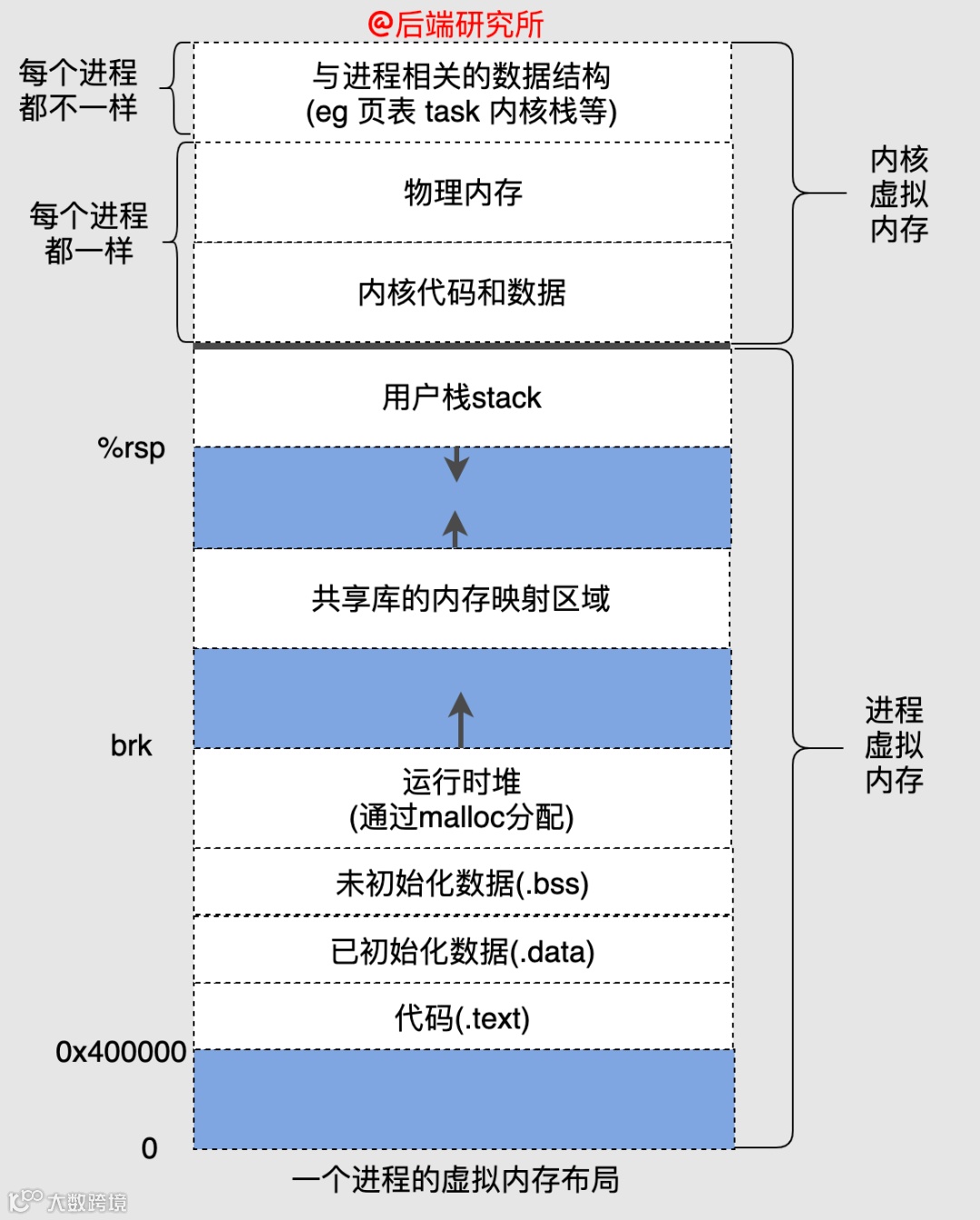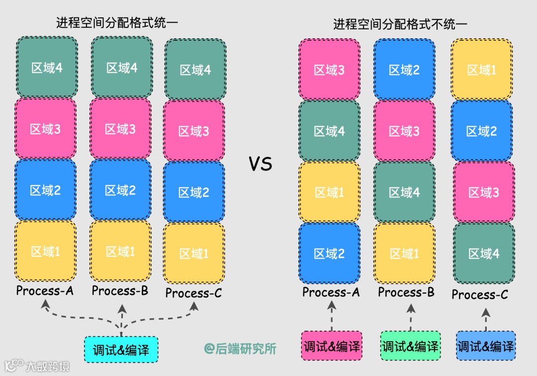 换句话说,如果所有进程的空间地址分配都是一样的,那么Linux在设计编译和调试工具时就非常简单了,否则每个进程都可能是定制化的。