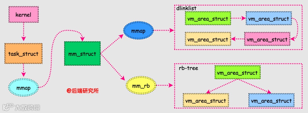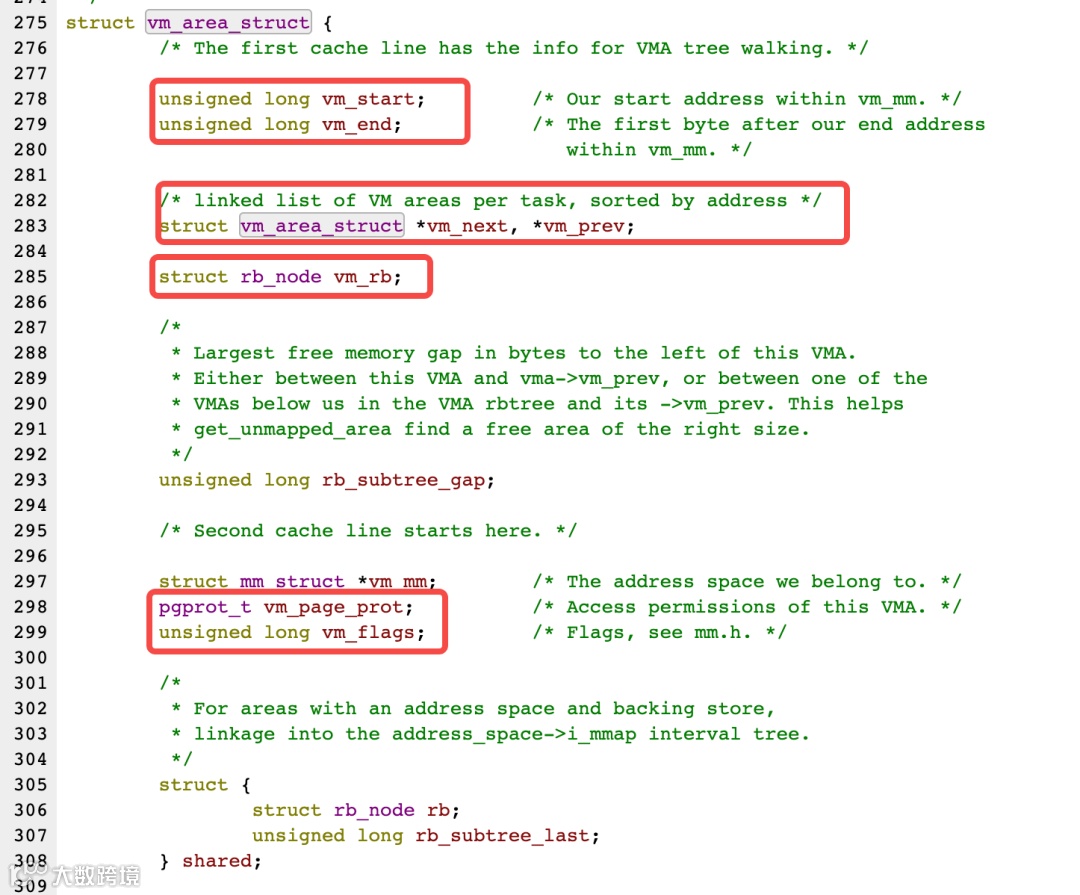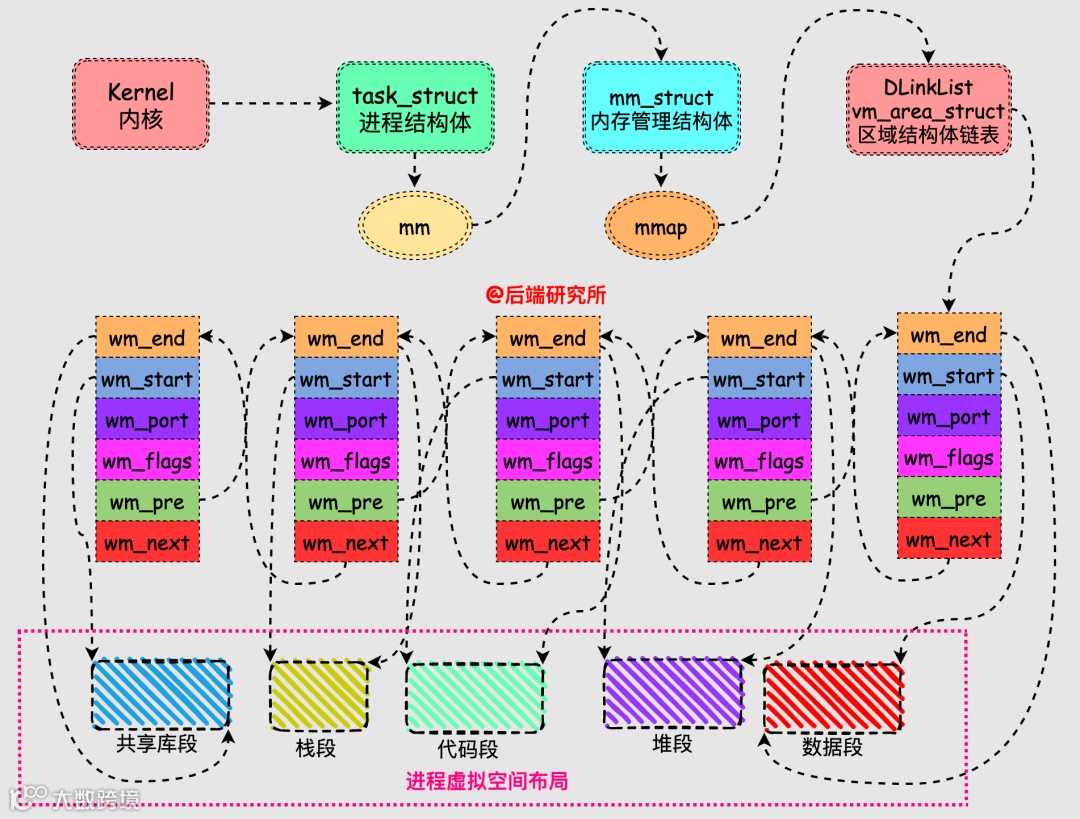 从前面可以看到进程虚拟空间就是一块块不同区域的集合,这些区域就是我们上面的段,每个区域在Linux系统中使用vm_area_struct这个数据结构来表示的。