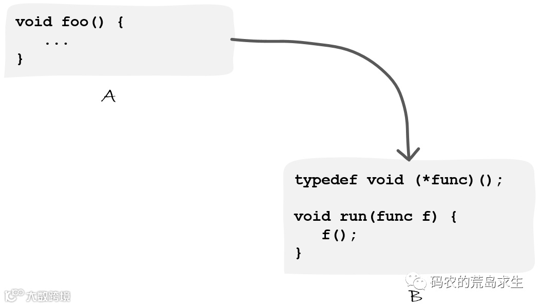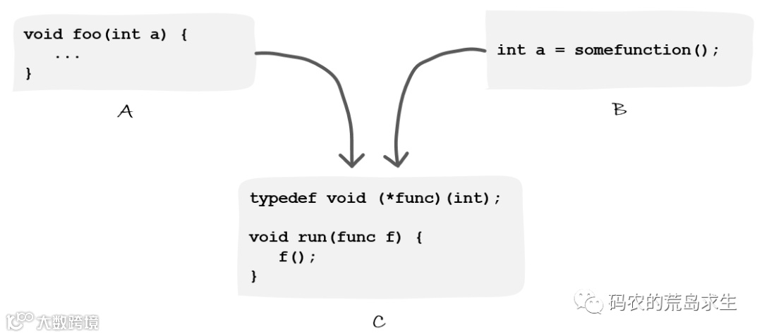 此时,单纯的函数指针已经不够用了,因为函数指针只是单纯的指向了内存中的一段代码,我们不但需要将内存中的一段代码同时也需要将内存中的一块数据传递给模块C,此时你可以定义一个结构体,将代码和数据打包起来,就像这样: