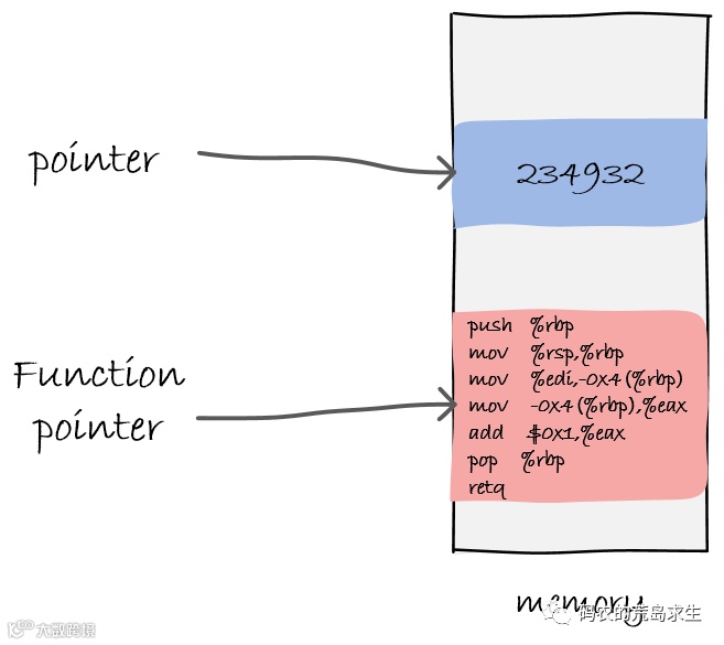 没有猜错吧,实际上函数指针本质也是一个指针,只不过这个指针指向的不是内存中的一段数据而是内存中的一段代码,就像这样: