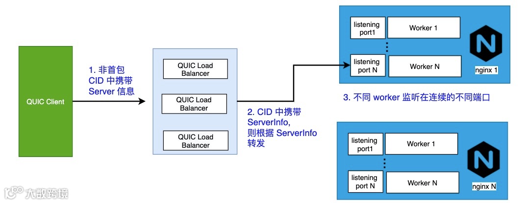 无论是否连接迁移,QUIC LB 都可以根据 ServerInfo,将报文转发到正确的进程。 -