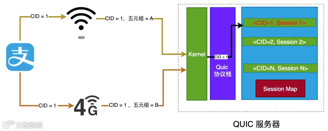 先说 连接迁移面临的问题 ,上文有提到,QUIC 有一项比较重要的功能是支持连接迁移。这里的连接迁移是指:如果客户端在长连接保持的情况下切换网络,比如从 4G 切换到 Wifi , 或者因为 NAT Rebinding 导致五元组发生变化,QUIC 依然可以在新的五元组上继续进行连接状态。QUIC 之所以能支持连接迁移,一个原因是 QUIC 底层是基于无连接的 UDP,另一个重要原因是因为 QUIC 使用唯一的 CID 来标识一个连接,而不是五元组。