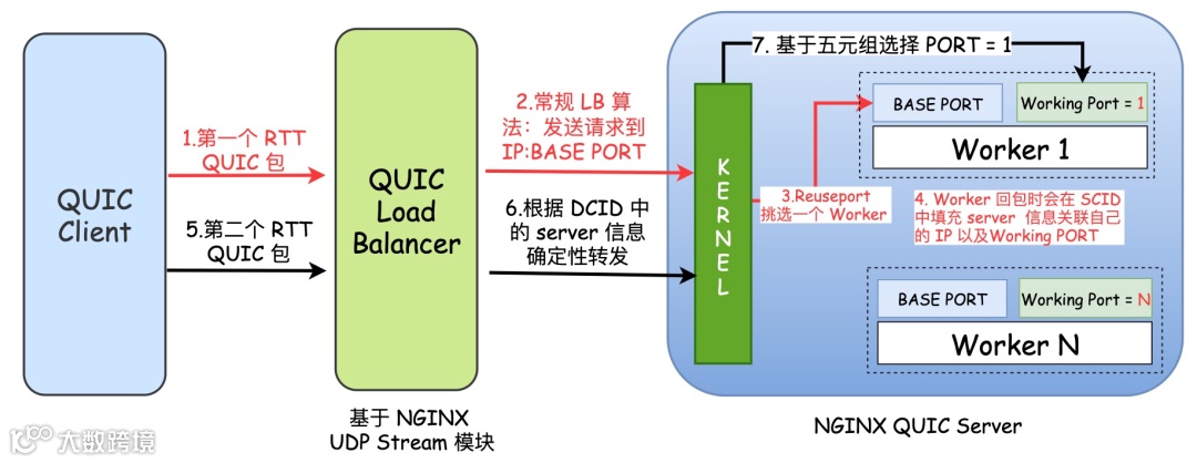 NGINX QUIC 服务器:开发了 NGINX_QUIC_MODULE,每个 Worker 监听两种类型的端口: (1)BASE PORT ,每个 Worker 使用的相同的端口号,以 Reuseport 的形式监听,并暴露给 QUIC LB,用以接收客户端过来的第一个 RTT 中的数据包,这类包的特点是 DCID 由客户端生成,没有路由信息。 (2)Working PORT,每个 Worker 使用的不同的端口号,是真正的工作端口,用以接收第一个 RTT 之后的 QUIC 包,这类包的特定是 DCID 由服务端的进程生成携带有服务端的信息。