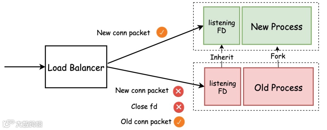 而 old process 此时如果关闭 listenging socket, 则在途的数据包便无法接收,达不到优雅退出的目的。 而如果继续监听,则新老进程都会同时收取新连接上的报文,导致老进程无法退出。