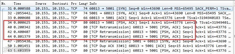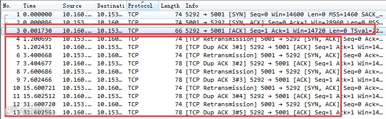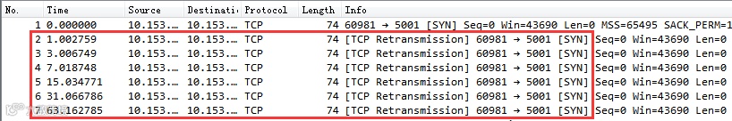 通过该图可以看到,客户端在 1 s 以后进行了第一次握手重试。重试仍然没有响应,那么接下来依次又分别在 3 s、7 s 15 s,31 s,63 s 等时间共重试了 6 次(我的 tcp_syn_retries 当时设置是 6)。