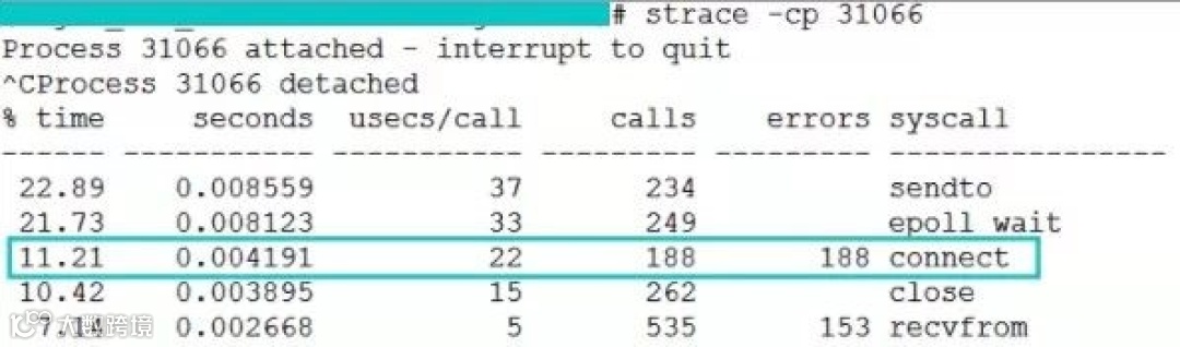 这是线上截取到的正常时的 connect 系统调用耗时,是 22 us(微秒)。