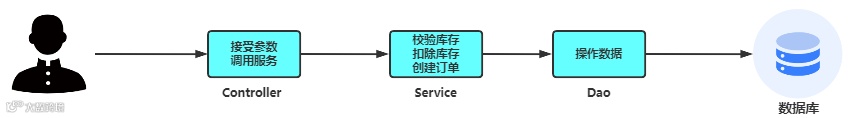 Controller层获得用户秒杀请求后调用Service层。Service层获得请求后要要检查已售数据跟库存总量是否一致,一致说明商品卖没了,不一致说明还有库存,那就调用DAO层对已售数量进行加1。DAO层获得请求后直接通过MyBatis操作数据库实现已售数量加1跟订单创建。