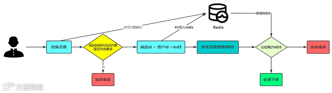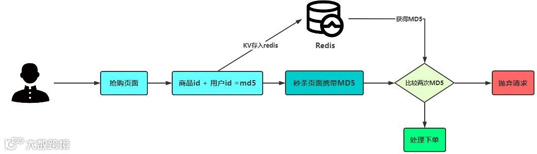 用户请求秒杀URL的时候需携带MD5值,然后Service层会根据商品id + 用户id从redis中获取下对应的value,看这个value跟MD5值是否一致,绝对下一步操作。
