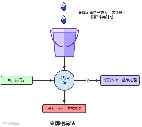 请求达到后首先要获取令牌桶中的令牌,拿着令牌才可以进行其他的业务逻辑,处理完业务逻辑之后,将令牌直接删除。