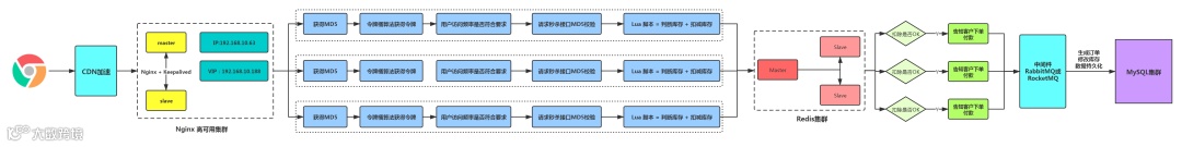 CDN加速:为何京东物流快,因为人在全国各地配置了多个仓库。同理,我们可以将前端的一些静态东西配置在全国各个不同的地方,用户请求时,直接请求距离自己最近的前端资源即可。前端按钮灰色化:如果参与过秒杀活动会发现,没到秒杀时间时秒杀按钮是灰色状态的,只有时间到了才是可点击状态。并且秒杀开始咯也不是一直可以点的,可能只允许1秒内点10次那种的。Nginx负载均衡:一个tomcat的QPS一般在200~1000左右,如果淘宝或京东性质的秒杀,就需要搞个Nginx负载均衡来支持几万级别的并发了。信息存储Redis化:单独的MySQL是无法支撑上万的QPS的,既然Redis号称可支持10W级的QPS,我们把数据信息存到Redis中就好咯嘛!有人可能会说MySQL有乐观锁跟事务性啊,Redis不是没有事务性么,其实我们可以通过 Lua 脚本来实现并发情况下Redis的事务性操作。消息中间件-流量削峰:秒杀成功后,如果秒杀的成功量过大,全部订单直接写入MySQL也是不太恰当的,可以把秒杀成功的用户信息写入消息中间件。比如RabbitMQ、Kafka,给用户返回抢购成功信息,然后专门代码消费中间件信息(生成订单,数据持久化),因为是异步消费,为防止用户秒杀成功后无法看到订单信息,在订单生成前给用户提示订单提交排队中,啥时候订单异步消费成功了再告知用户成功。辅助手段:秒杀前做个预演练是必须的吧,系统上线后QPS监控、CPU监控、IO监控、缓存监控也是必须要搞的。同时一旦服务真的扛不住了熔断跟限流也要考虑进去。