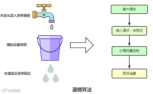 漏桶算法思路:把水比作是请求,漏桶比作是系统处理能力极限,水先进入到漏桶里,漏桶里的水按一定速率流出,当流出的速率小于流入的速率时,由于漏桶容量有限,后续进入的水直接溢出(拒绝请求),以此实现限流。