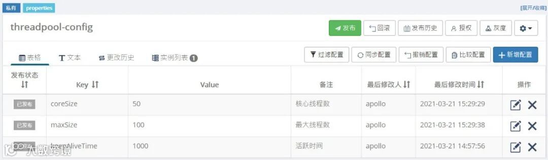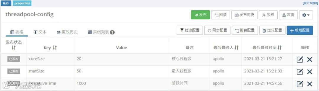 现在我们可以把线程池和Apollo结合起来构建动态线程池。首先我们用默认值构建一个线程池,然后线程池会监听Apollo相关配置项,如果相关配置有变化则刷新相关线程池参数。第一步在Apollo配置中心设置三个线程池参数(本文省略拒绝策略设置):