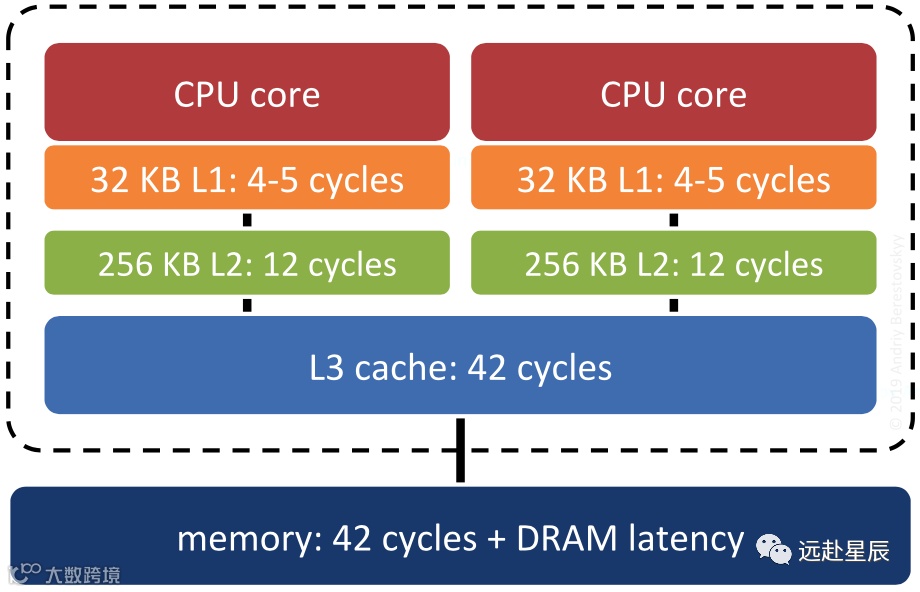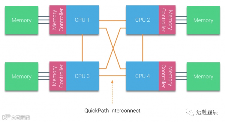 其次是基于 NUMA 架构的考虑,在 NUMA 体系下,内存控制器芯片被集成到处理器内部,形成 CPU 本地内存,访问本地内存只需通过内存通道而无需经过系统总线,访问时延大大降低,而多个处理器之间通过 QPI 数据链路互联,跨 NUMA 节点的内存访问开销远大于本地内存的访问: