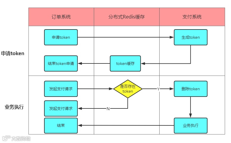 第二阶段:订单系统拿着申请到的token发起支付请求,支付系统会检查Redis中是否存在该token,如果存在,表示第一次发起支付请求,删除缓存中token后开始支付逻辑处理;如果缓存中不存在,表示非法请求。