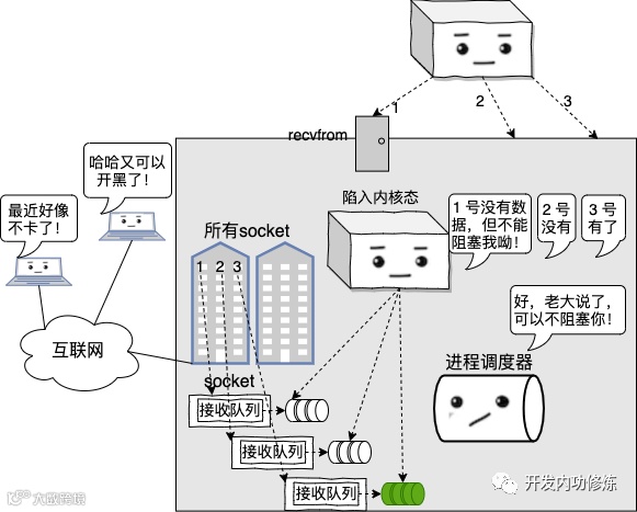 但是我的问题是我还是不知道用户啥时候把数据发过来。如果没有就绪的,那我只能就频繁循环地不断地来内核询问。