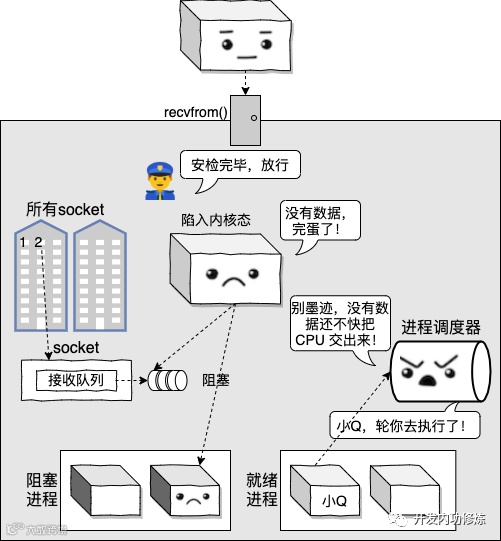 而且频繁的阻塞导致我的工作效率特别低下。 第一我们阻塞要花不少的时间保存我们当前的工作状态,第二我们在 L1/L2/L3 等 cache 里准备了好多工作时要用的缓存这下全没用了。