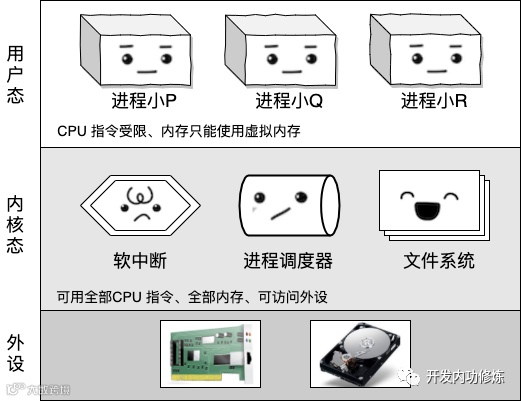 我们天然和内核里的小伙伴们被隔离开来。我们大部分时间都运行在用户态,其它的兄弟们都一直运行在内核态。