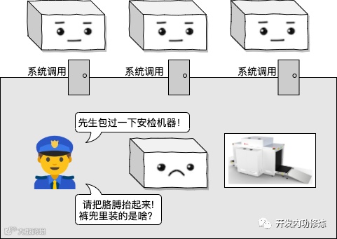 如果我们需要这些功能的时候,需要通过系统调用先陷入到内核态中。不过在陷入之前,系统调用入口要对我们执行严格的安检。