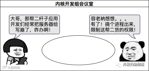 其实就是内核的开发都认为应用开发是傻逼,怕应用开发的代码把服务器给搞坏。就设计了我们进程出来,专门运行各种用户态的代码。