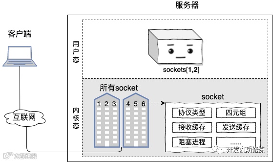 我们进程通过一个叫 socket 的哥们来和我们的用户通信。但是实际上所有的 socket 以及整台机器上的网络包都是在内核态来把控着的,我们只能拿到 socket 的编号。
