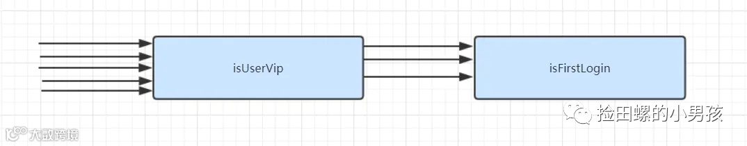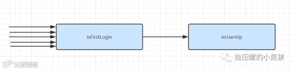 假设总共有5个请求进来,isUserVip通过的有3个请求,isFirstLogin通过的有1个请求。那么以上代码,isUserVip执行的次数为5次,isFirstLogin执行的次数也是3次,如下: