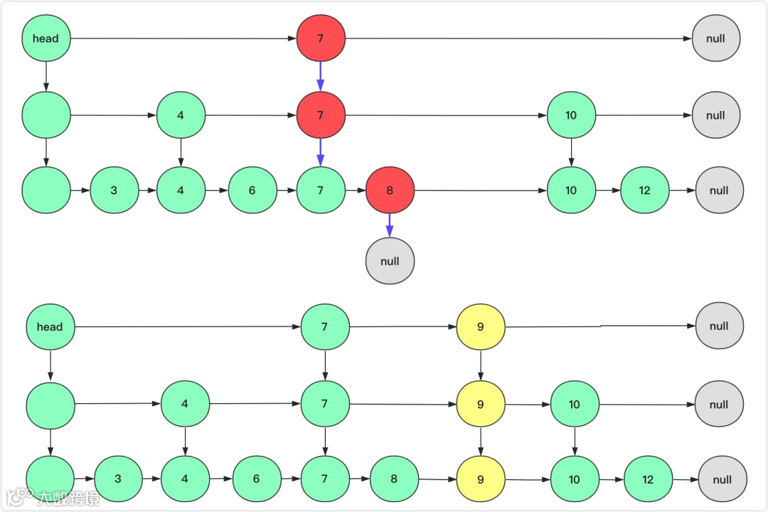 例如上图删除10节点,首先team=head从team出发,7<10向右(team=team.right后面省略);第二步右侧为null只能向下;第三部右侧为10在当前层删除10节点然后向下继续查找下一层10节点;第四步8<10向右;第五步右侧为10删除该节点并且team向下。team为null说明删除完毕退出循环。