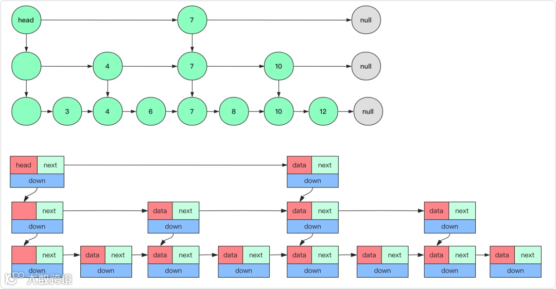 对于上面,跳表完整分析就结束啦,当然,你可能看到不同品种跳表的实现,还有的用数组方式表示上下层的关系这样也可以,但本文只定义right和down两个方向的链表更纯正化的讲解跳表。