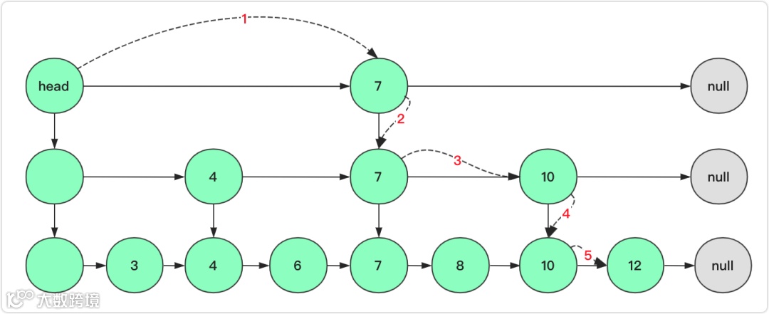 例如上图查询12节点,首先第一步从head出发发现右侧不为空,且7<12,向右;第二步右侧为null向下;第三步节点7的右侧10<12继续向右;第四步10右侧为null向下;第五步右侧12小于等于向右。第六步起始发现相等返回节点结束。