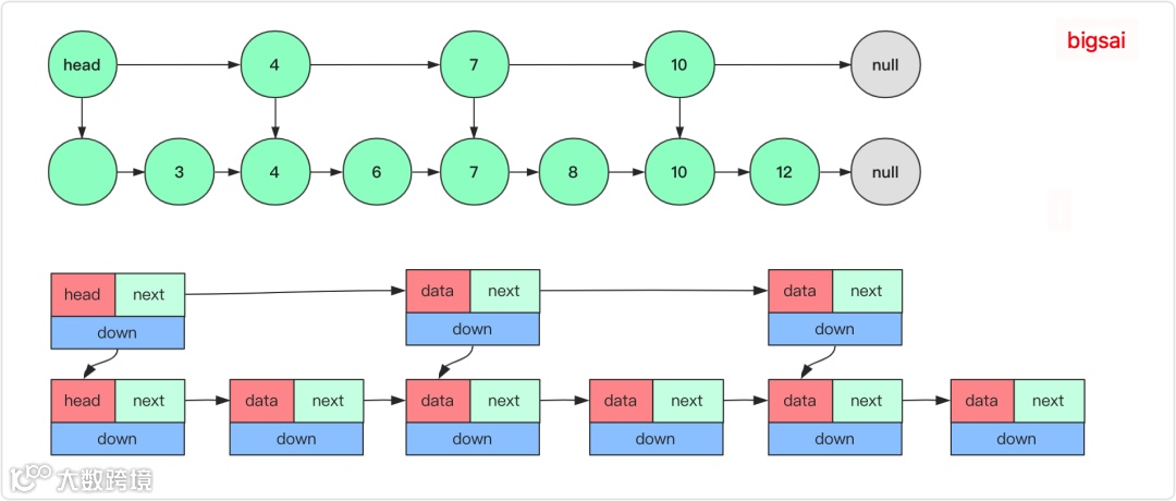 这样,在查询某个节点的时候,首先会从上一层快速定位节点所在的一个范围,如果找到具体范围向下然后查找代价很小,当然在表的结构设计上会增加一个向下的索引(指针)用来查找确定底层节点。平均查找速度平均为O(n/2)。但是当节点数量很大的时候,它依旧很慢很慢。我们都知道二分查找是每次都能折半的去压缩查找范围,要是有序链表也能这么跳起来那就太完美了。没错跳表就能让链表拥有近乎的接近二分查找的效率的一种数据结构,其原理依然是给上面加若干层索引,优化查找速度。