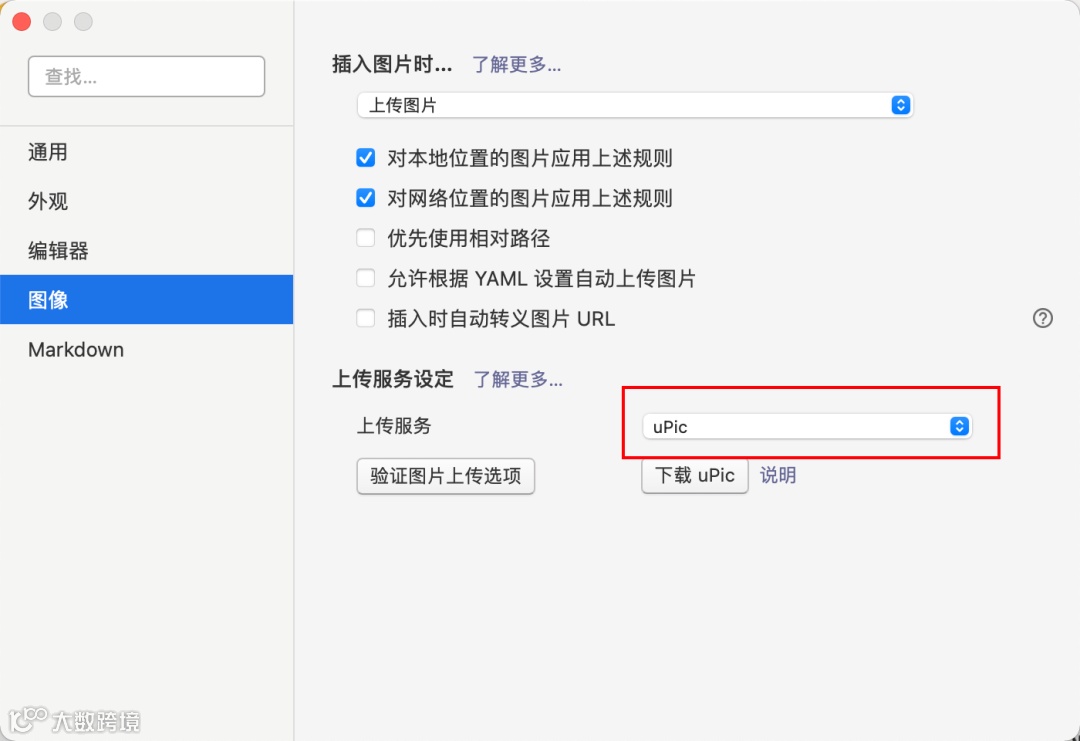 Typora 偏好设置里面配置图片上传工具为 uPic。