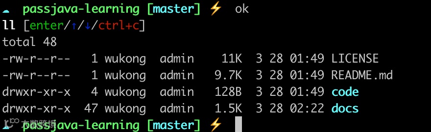 然后输入 ok,会提示是不是想要输入 ll命令,按 enter 键即可执行 ll 命令。上下键还可以切换其他命令。如下图所示: