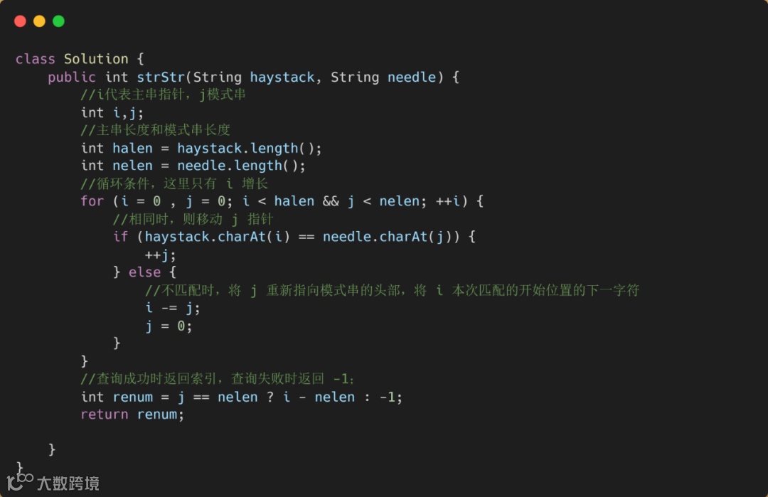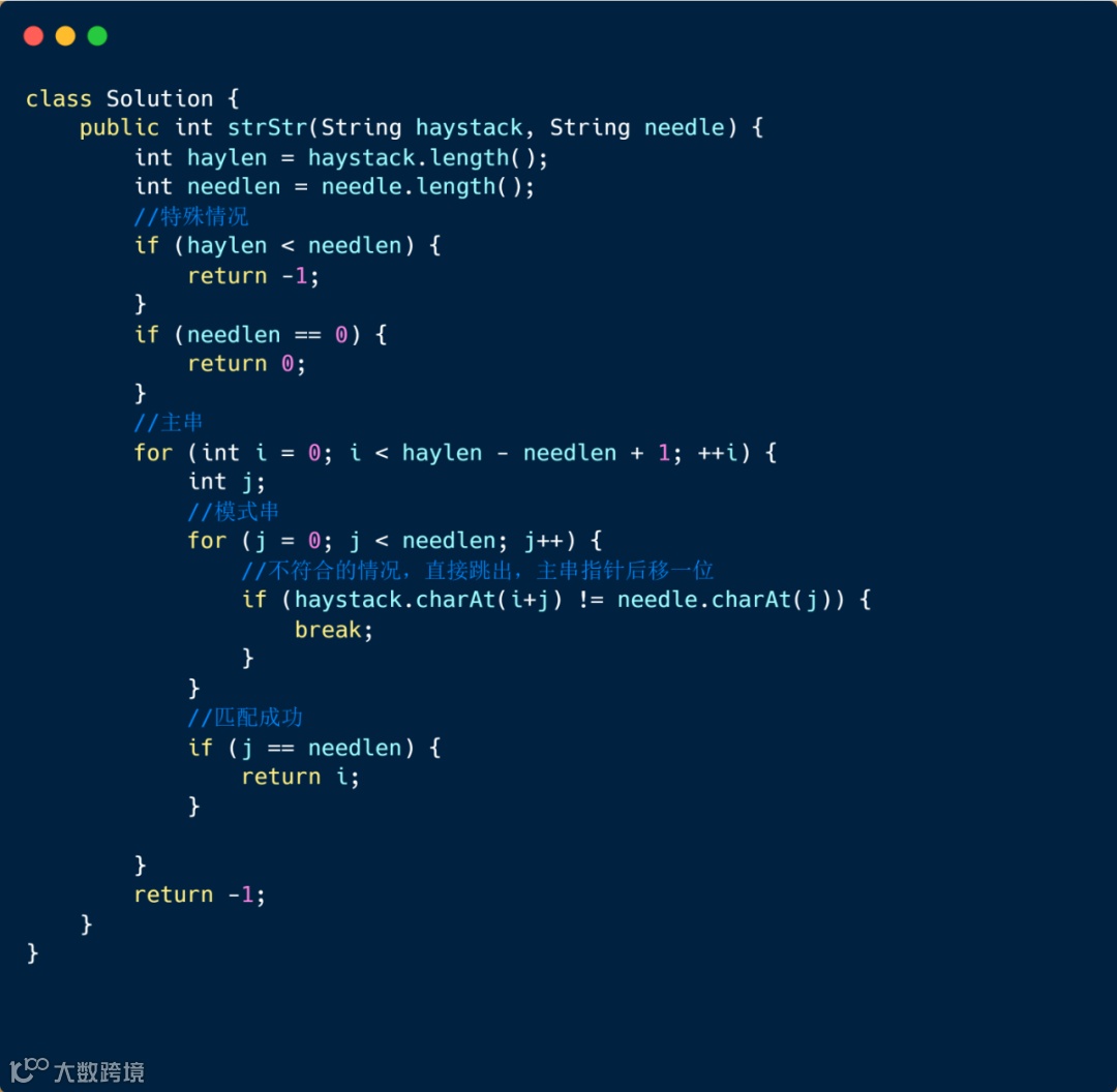 其实这个题目很容易理解,但是我们需要注意的是一下几点,比如我们的模式串为 0 时,应该返回什么,我们的模式串长度大于主串长度时,应该返回什么,也是我们需要注意的地方。下面我们来看一下题目代码吧。