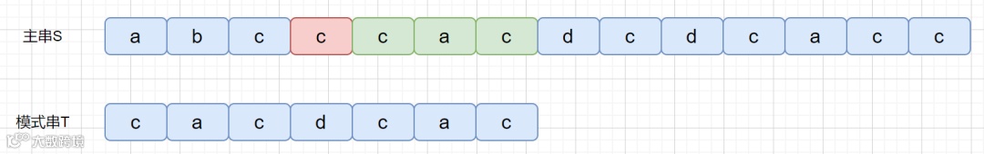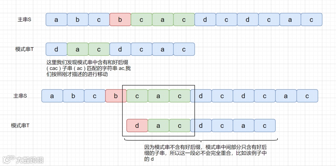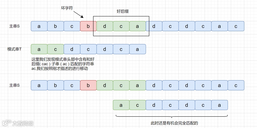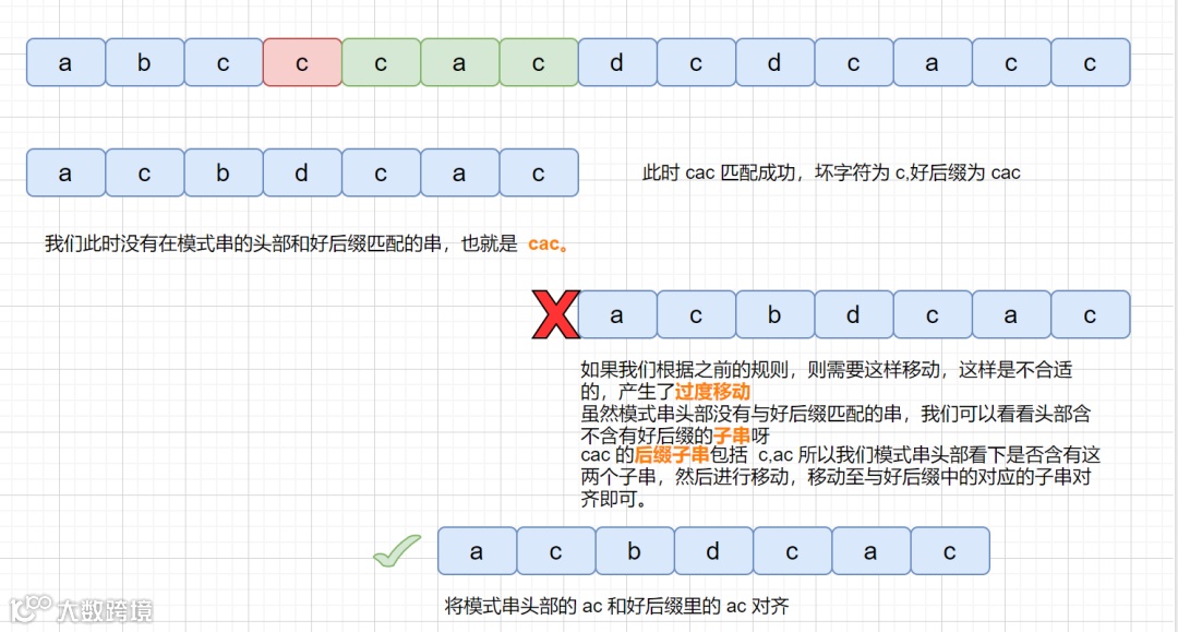 BM 算法是从右往左进行比较,发现坏字符的时候此时 cac 已经匹配成功,在红色阴影处发现坏字符。此时已经匹配成功的 cac 则为我们的好后缀,此时我们拿它在模式串中查找,如果找到了另一个和好后缀相匹配的串,那我们就将另一个和好后缀相匹配的串 ,滑到和好后缀对齐的位置。