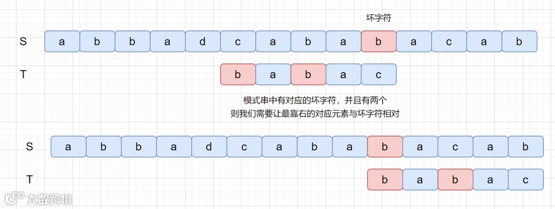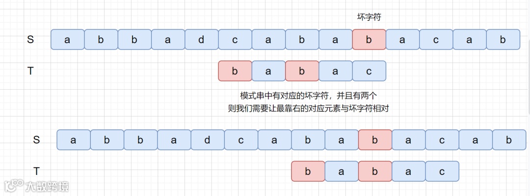 那么我们为什么要让最靠右的对应元素与坏字符匹配呢?如果上面的例子我们没有按照这条规则看下会产生什么问题。