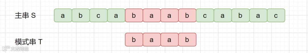 在上图中,我们试图找到模式串 T = baab,在主串 S = abcabaabcabac 中第一次出现的位置,即为红色阴影部分, T 第一次在 S 中出现的位置下标为 4 ( 字符串的首位下标是 0 ),所以返回 4。如果模式串 T 没有在主串 S 中出现,则返回 -1。