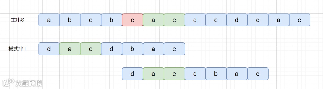 然后我们继续从右往左进行比较,发现 d 为坏字符,则需要将模式串中的 d 和坏字符对齐。